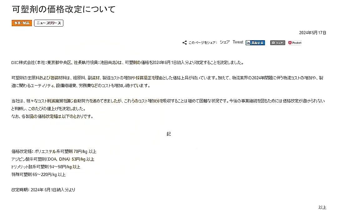 DIC:自6月1日交貨時起開漲:聚酯類增塑劑漲70日元/kg以上,己二酸系增塑劑(DOA、DINA)漲53日元/kg以上,偏苯三酸系增塑劑漲94~98日元/kg以上;特殊增塑劑漲65~220日元/kg以上。