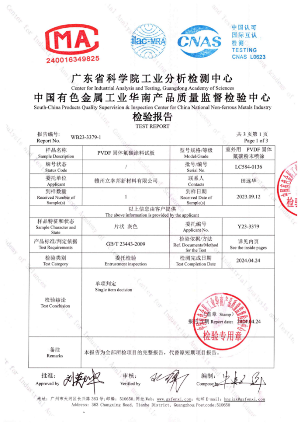 據廣東省科學院工業分析檢測中心提供的檢驗報告,立幸邦PVDF(70%)固體氟碳涂料加速老化4000小時后,仍能保持超高的保光度。此外,色差、鉛筆硬度、干式附著力、濕式附著力、耐鹽酸、耐硝酸、耐砂漿、耐溶劑、耐磨性等均符合要求。可見在環保日益嚴苛的大環境下,立幸邦PVDF(70%)固體氟碳涂料已經成為液體氟碳漆的升級產品。