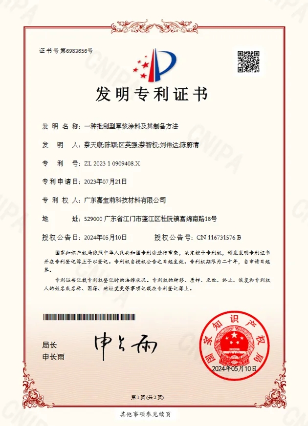 中國發(fā)明專利: 一種批刮型厚漿涂料及其制備方法 (專利號(hào): ZL 2023 1 0909408.X)
