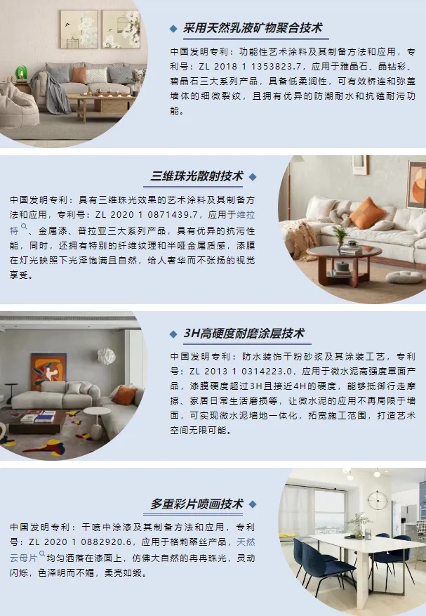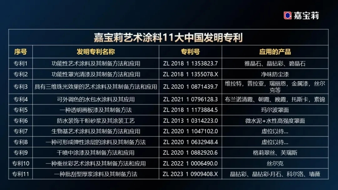 這些中國發(fā)明專利技術(shù)在產(chǎn)品研發(fā)上的應(yīng)用,不僅提升了嘉寶莉藝術(shù)涂料的品質(zhì)和性能,也為用戶帶來了更優(yōu)的家居墻面涂裝體驗(yàn)及更美好的空間裝飾效果感受。