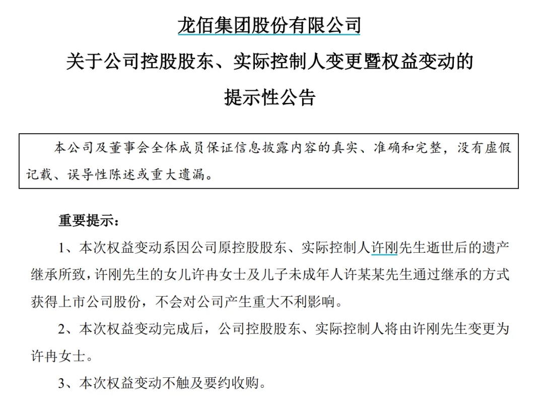 6月20日晚間,上述兩家上市公司先后披露實控人變更公告,許剛生前持有的龍佰集團股份,分別由“90后”的女兒許冉和尚未成年的兒子繼承。