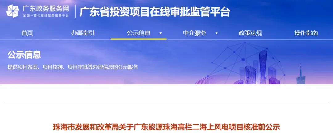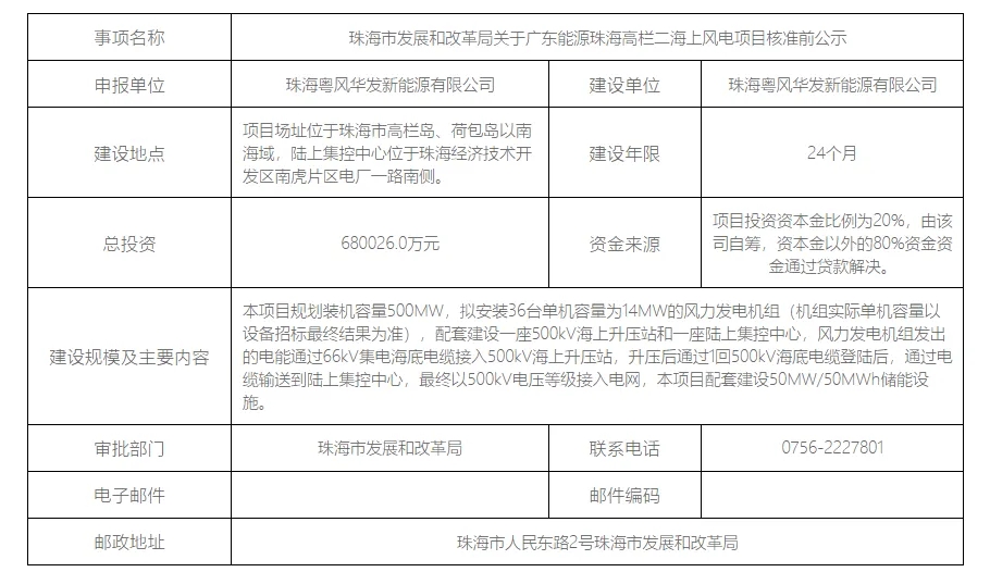 近日,珠海市發展和改革局發布關于廣東能源珠海高欄二海上風電項目核準前公示。