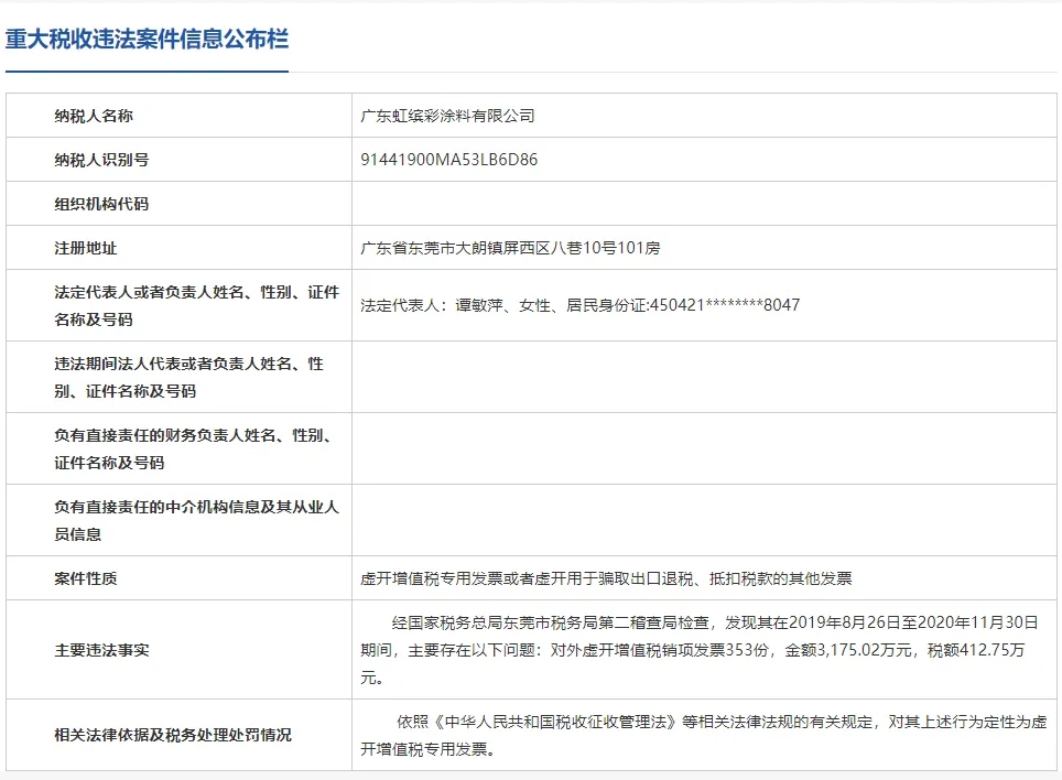 廣東虹繽彩涂料在2019年8月26日至2020年11月30日期間,對外虛開增值稅銷項發票353份,金額3175.02萬元,稅額412.75萬元。 依照相關法律法規的有關規定,對其上述行為定性為虛開增值稅專用發票。