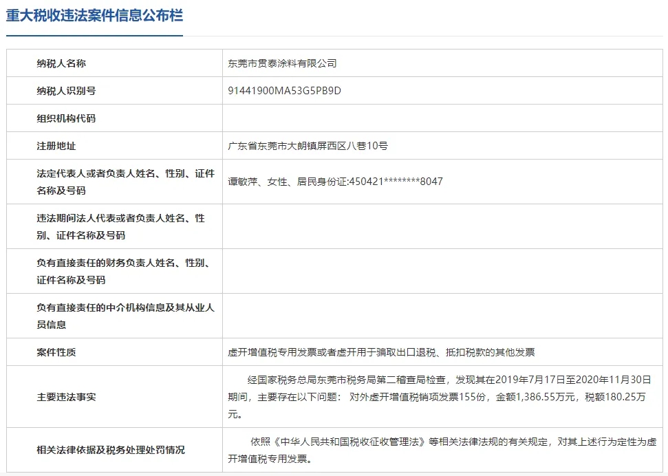 東莞市貫泰涂料在2019年7月17日至2020年11月30日期間,對外虛開增值稅銷項發票155份,金額1386.55萬元,稅額180.25萬元。依照相關法律法規的有關規定,對其上述行為定性為虛開增值稅專用發票。