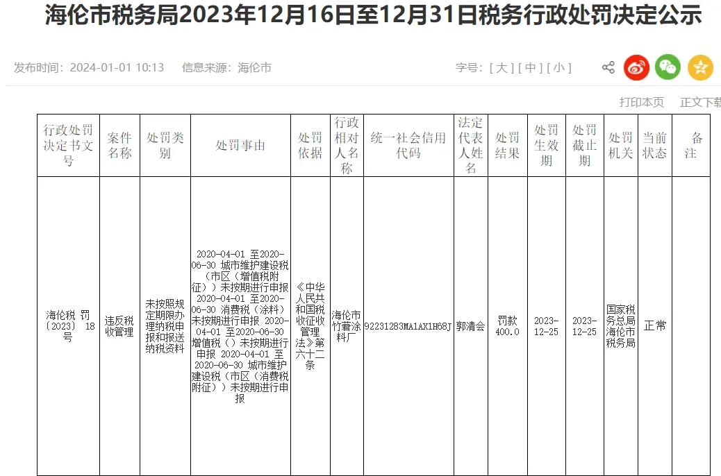 海倫市竹莙涂料廠2020-04-01至2020-06-30城市維護建設稅(市區(增值稅附征))未按期進行申報2020-04-01至2020-06-30消費稅(涂料)未按期進行申報2020-04-01至2020-06-30增值稅)未按期進行申報2020-04-01至2020-06-30城市維護建設稅(市區(消費稅附征))未按期進行申報,違反稅收管理,罰款400元。