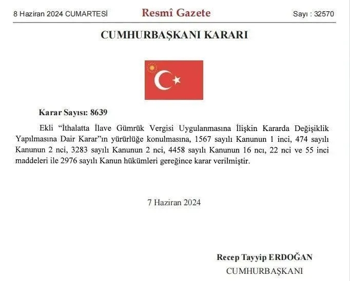 土耳其公告發(fā)布第8639號(hào)總統(tǒng)令,規(guī)定對(duì)原產(chǎn)地為中國(guó)、海關(guān)編碼為8703項(xiàng)下的燃油及混合動(dòng)力乘用車征收40%額外進(jìn)口關(guān)稅,并自發(fā)布日起30日后實(shí)施。根據(jù)公報(bào)公布的規(guī)定,每車最低關(guān)稅為7000美元(約合人民幣5萬元)。至此,中國(guó)對(duì)土出口全部乘用車均在加稅范圍內(nèi)。
