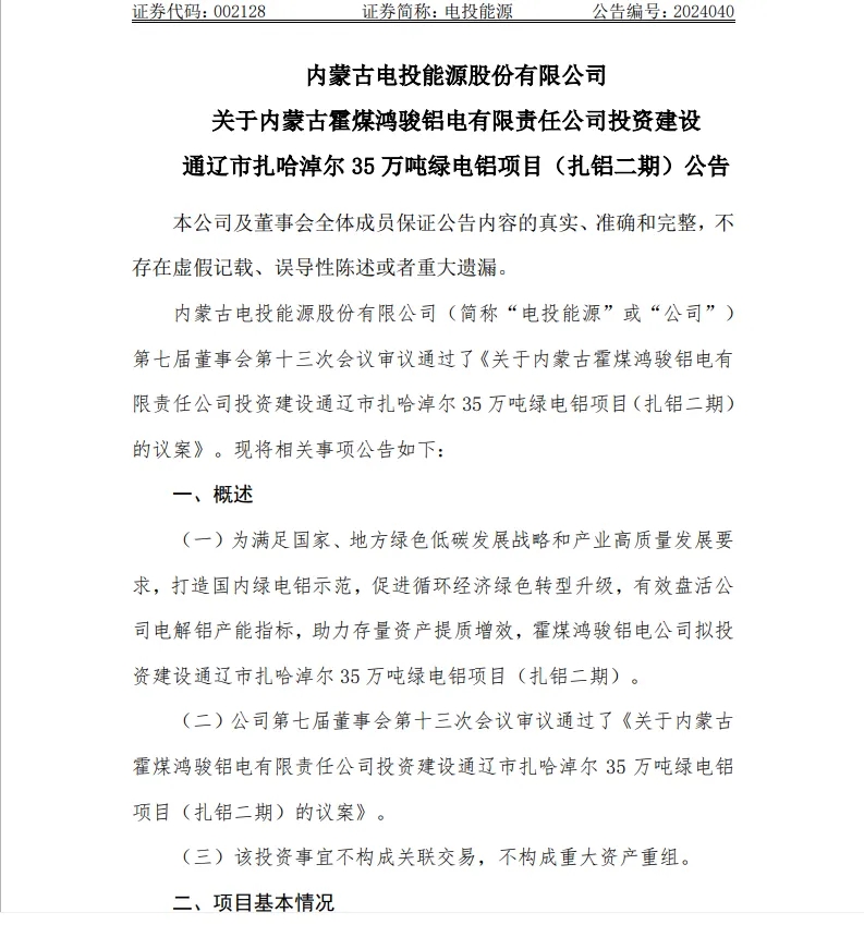 電投能源稱,本次投資是為滿足國家、地方綠色低碳發(fā)展戰(zhàn)略和產(chǎn)業(yè)高質(zhì)量發(fā)展要求,打造國內(nèi)綠電鋁示范,促進循環(huán)經(jīng)濟綠色轉(zhuǎn)型升級,有效盤活公司電解鋁產(chǎn)能指標,助力存量資產(chǎn)提質(zhì)增效。