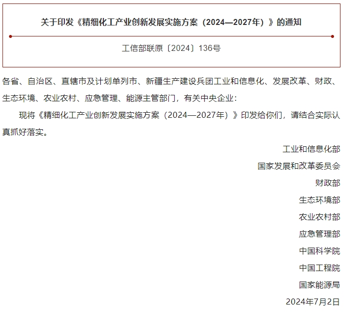 (一)加強組織領導。加強部門協同和部省聯動,指導地方結合實際和特色優勢出臺配套政策,將精細化工產業創新發展納入本部門、本地區重點工作。完善關鍵領域攻關機制,鼓勵骨干企業針對本方案中的相關創新攻關任務勇于揭榜,加大創新投入,補齊產業鏈短板。發揮有關行業協會、學會、咨詢機構等作用,為產業發展提供重大決策咨詢和智庫支撐,完善重點產業鏈供需對接平臺,加強對企業的指導和服務?! ?二)加大政策支持。加強財政、金融、區域、投資、進出口、能源、生態環境、價格等政策與產業政策的協同。利用現有政策渠道,體系化支持精細化工產業基礎研究、技術創新、設備更新及技術改造。實施“科技產業金融一體化”專項工作,依托硬科技屬性評價和上市培育機制以及地方政策配套,引導社會資本支持精細化工產業早期科技創新。鼓勵國家制造業轉型升級、國家中小企業發展基金等產業投資基金及金融機構等社會資本,支持精細化工企業發展。發揮國家產融合作平臺作用,解決企業發展高端產品、實施老舊裝置技改等融資需求。落實好“首批次”重點新材料保險補償政策,支持創新產品推廣應用。 (三)優化保障服務。優化企業管理考核激勵機制,引導企業加大研發投入,打造原創技術策源地。完善精細化工產品分類、性能表征、質量評價、測試方法、應用驗證和安全環保等標準體系,提升行業測試評價服務能力。加強全球產業鏈供應鏈合作,強化跨國企業在華重點領域投資服務,支持優勢企業用好“一帶一路”建設、RCEP全面生效等契機開展對外投資,提高全球要素資源統籌配置能力。加大精細化工領域知識產權保護力度,營造公平競爭環境。各地要取消限制精細化工企業入園的不合理政策,加快推動精細化工項目落地實施。