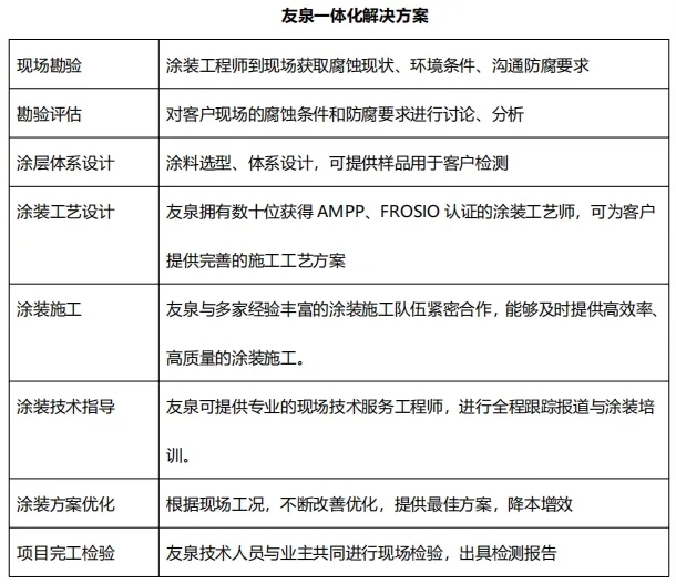 在重防腐領域,友泉新材料秉承全生命周期防腐解決方案。這一方案涵蓋了從目標設定、腐蝕源分析、材料選擇、技術應用、設計制造到驗收使用、測試檢驗、維護保養、維修延壽直至最終報廢的全過程。友泉新材料堅持整體性、系統性的原則,確保防腐工程的相互協調和優化,以實現安全、經濟和社會效益的最大化。