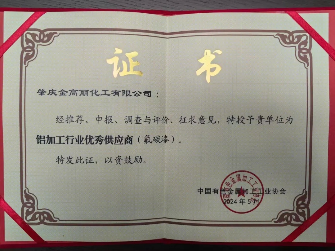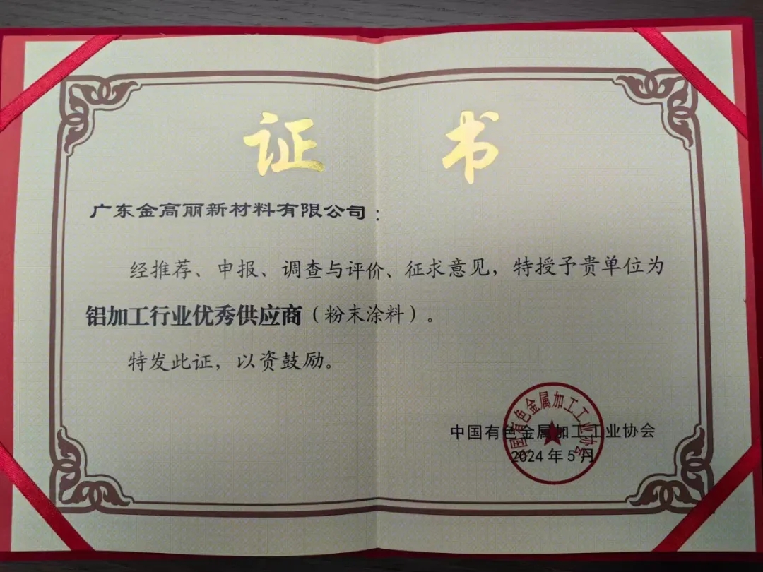 經企業推薦、專家評審、公示,2024年,共計有69家企業入選鋁加工優秀供應商名單,金高麗粉末涂料、氟碳漆榮獲中國鋁加工行業優秀供應商兩項殊榮,其中氟碳油漆是該類產品唯一獲此殊榮的企業。金高麗以卓越的品質、專業的服務,在合作中展現了頗高的誠信與默契,為行業發展提供了強而有力的支持。