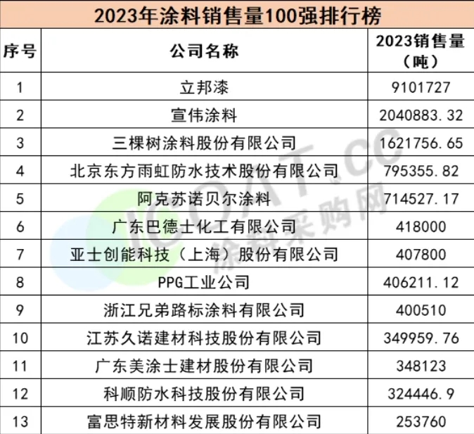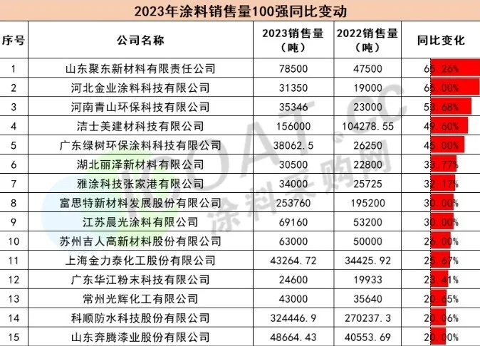 其中,科順防水科技股份有限公司(以下簡稱“科順防水”)在整個涂料市場需求疲軟的情況下,維穩(wěn)前進(jìn),創(chuàng)造了亮眼的營收額和穩(wěn)定的同比增長。據(jù)統(tǒng)計,科順防水2023年的銷售量達(dá)到324446.9噸,在榜單中位居第12名;對比2022年的銷售量270237.3噸,實現(xiàn)了同比增長20.06%。在整個涂料銷量100強(qiáng)企業(yè)同比變動的榜單中排名第14,發(fā)展穩(wěn)定。