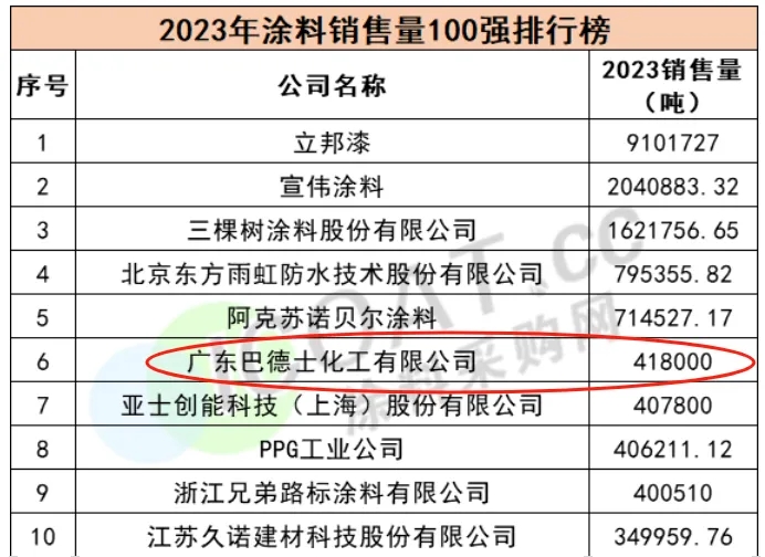 其中,廣東巴德士新材料有限公司(以下簡稱“巴德士”)以418000噸的銷售量位居第六,成功躋身涂料銷售量十強行列。據悉,2023年的百強榜單現狀仍是外資企業占據半壁江山,民族企業發展舉步維艱。然而。作為榜單十強中為數不多的中國企業,巴德士在外資企業不斷擠占生存空間的情況下,仍取得了顯著的成就——今年的銷售量較去年增長了38000噸,較去年同比增長10%,排名也因此上升了一名,并逐年呈上升趨勢。值得注意的是,2023年銷售量區間為10-50萬噸的涂料企業中僅有25家,占榜單總數的25.38%。巴德士作為這一區間中的領軍企業,其銷售量更是突破40萬噸大關,實現了嶄新的跨越式發展。