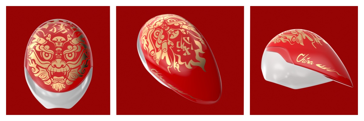 麒麟頭盔圖案借鑒故宮麒麟面部特征,保留獅頭、圓額、鹿角的麒麟特點進行二次藝術創作,用中國傳統書法書寫的“勝”字閃耀于麒麟額頭,側邊運用火的元素和英文“China”巧妙融合,不僅將運動員在賽場一騎絕塵的動感顯示于頭盔之中,更是把中國傳統文化融入到頭盔圖案設計,激勵著中國隊在國際賽場上不斷創造佳績。