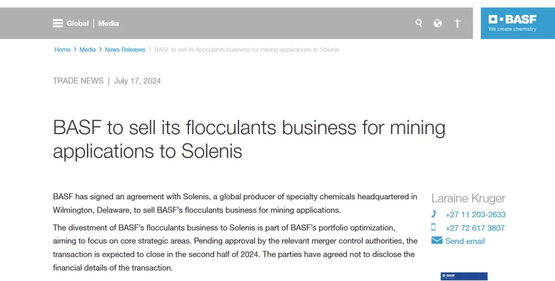 巴斯夫宣布,將用于采礦的絮凝劑業(yè)務出售給美國特種化學品生產(chǎn)商索理思。而在1個月以前,巴斯夫宣布已將其位于美國圣地亞哥的Spartec®生物能源酶業(yè)務出售給拉曼集團的子公司Danstar Ferment AG和Lallemand Specialties Inc。