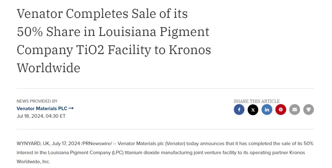 泛能拓將持有的路易斯安那顏料公司二氧化鈦制造合資企業(yè)工廠50%的股份轉(zhuǎn)讓給康諾斯。