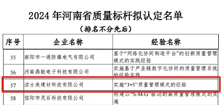 潔士美建材科技有限公司榮獲河南省質(zhì)量標桿企業(yè)