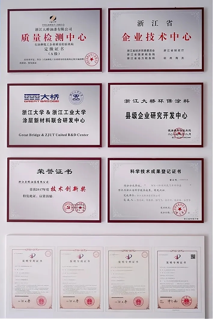 長期以來,大橋油漆堅以新質(zhì)生產(chǎn)力驅(qū)動架構(gòu),致力于為客戶提供好用不貴、質(zhì)量可靠的高品質(zhì)產(chǎn)品,而這些努力也逐漸結(jié)出了果實。截至目前,大橋油漆已榮膺浙江省“專精特新”企業(yè)、浙江省高新技術(shù)企業(yè)研究開發(fā)中心、浙江省企業(yè)技術(shù)中心、浙江省綠色企業(yè)等美譽。在這些頭銜的背后,是北京水立方、首都國際機場、杭州國際會議中心、廣州電視塔等一眾客戶朋友們信賴的眼光和實際的支持。