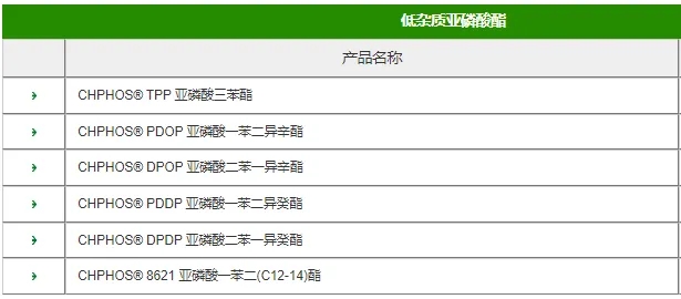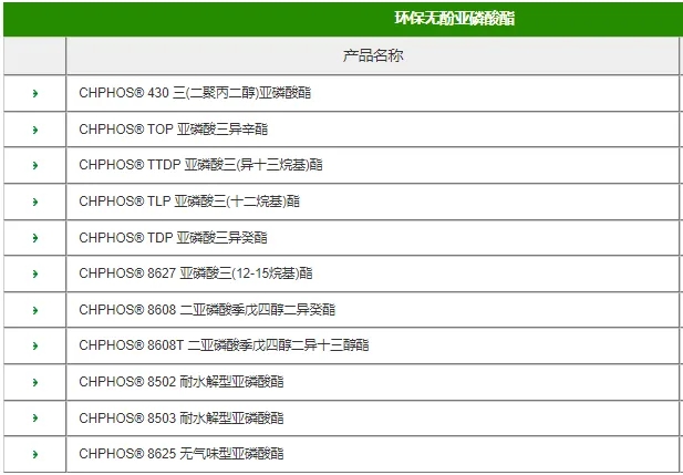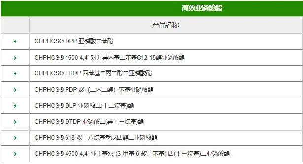 其中CHPHOS® PDOP 亞磷酸一苯二異辛酯/亞磷酸一苯二異癸酯產(chǎn)品,可用于聚碳酸酯、涂料、聚烯烴、ABS和PET纖維,在加工和后期均能提供良好的色澤改良性和熱穩(wěn)定性。