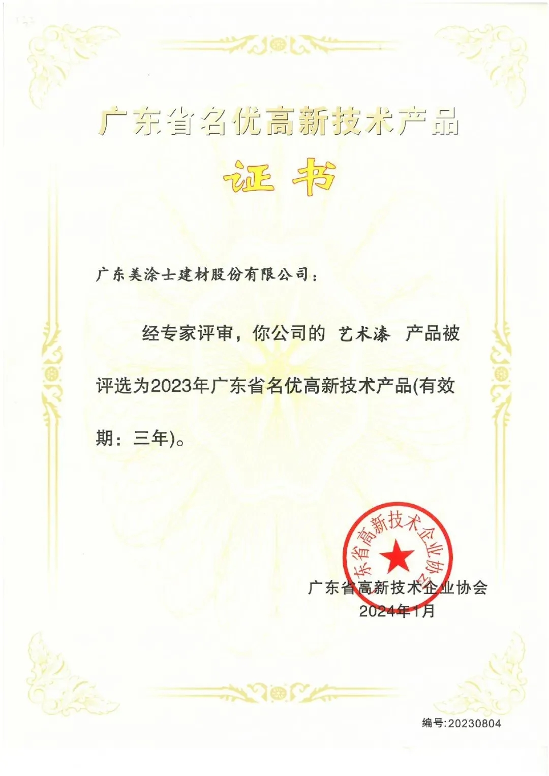 其中,美涂士的藝術漆、臻天然無機礦物漆以及高柔五合一綠柔防水等產品,還憑借其創新的技術、卓越的性能以及顯著的環保優勢,榮獲了廣東省名優高新技術產品證書。這一榮譽的獲得,不僅是對美涂士在高新技術領域取得成果的肯定,更是對其持續推動行業技術進步與產業升級的鼓勵與鞭策。