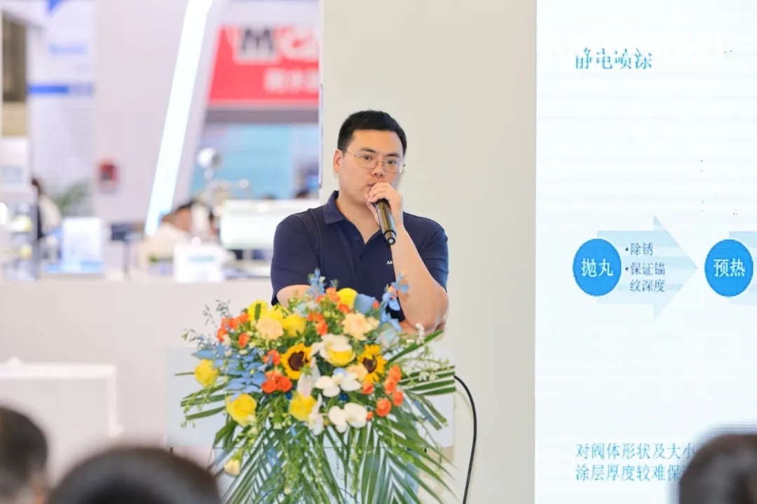 阿克蘇諾貝爾功能性粉末涂料研發經理陳鵬飛為觀眾介紹飲用水水管粉末涂料解決方案