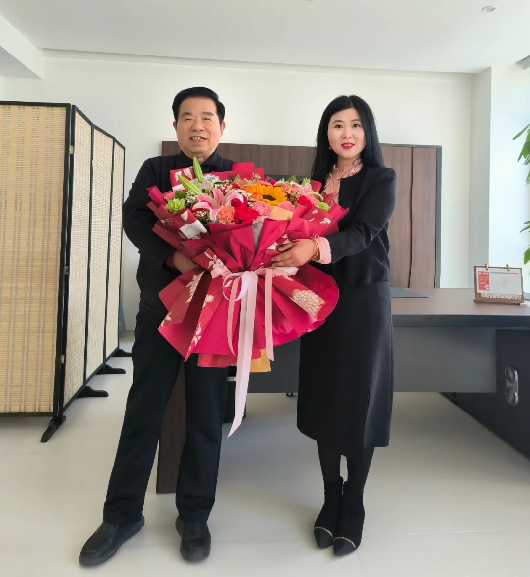 涂料采購網王賽(右)到訪臥龍涂料并與創始人李國報(左)合影