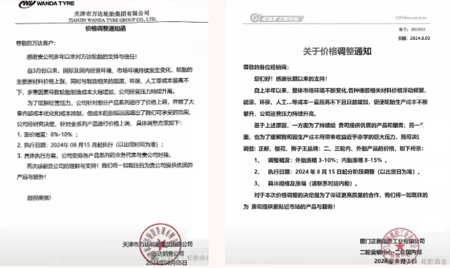 天津市萬達輪胎集團針對全系列產品價格上調6%-10%。