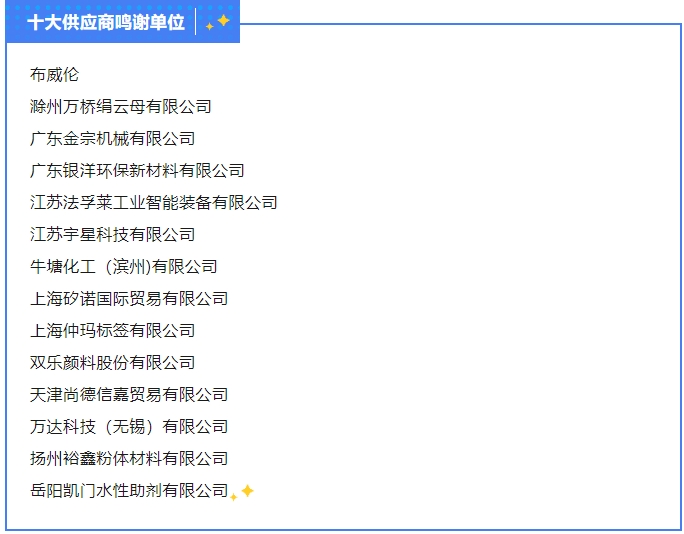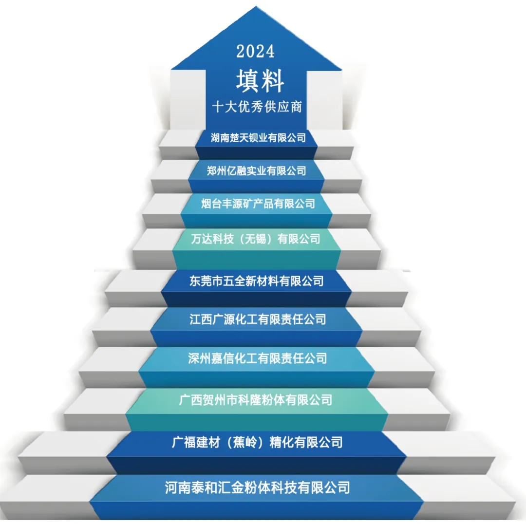 湖南楚天鋇業有限公司、鄭州億融實業有限公司等十家企業榮膺“填料十大優秀供應商”稱號,以穩定的性能和出色的環保表現,提升了涂料的物理性能,更以實際行動,助力涂料行業向更高方向邁進。