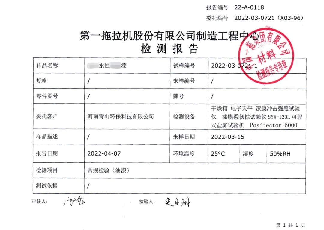 面對市場的質疑與挑戰(zhàn),啟杉水性工業(yè)漆以實際行動回應了外界所有疑慮。曾有一位客戶,對啟杉系列產品的性能持保留態(tài)度,抽取了多款啟杉水性工業(yè)漆進行了一個多月的嚴格反復測試。結果顯示,啟杉水性工業(yè)漆在防腐性、耐候性、附著力等關鍵指標上均展現(xiàn)出卓越表現(xiàn),不僅完全契合中國一拖集團東方紅系列大型農機水漆涂裝的高標準需求,更在多方面超越了客戶的預期,充分驗證了其技術實力與品質保障。