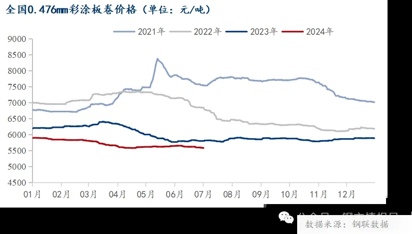 截止到2024年7月22日,全國彩涂板卷均價5506元/噸,較6月28日均價5581元/噸下跌75元/噸。2024年1-6月份,最高點為5903元/噸,最低點為5581元/噸,高低振幅322元/噸。從近4年走勢看,2024年上半年可以說是走得最為“平穩”的一年。從價格的絕對值看,2024年上半年為近4年來的最低位,而且低值一直在刷新。價格下跌,一方面在于整體需求表現不佳,另一方面在于上半年整體鋼鐵走勢趨勢均為下行。
