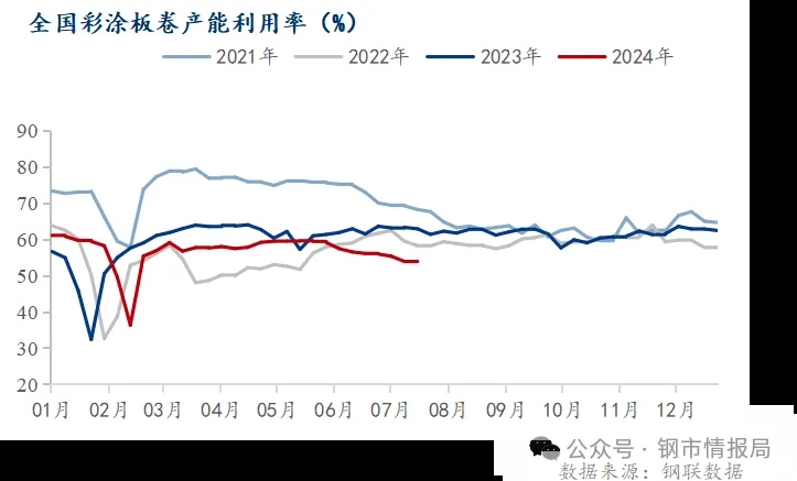 2、供應情況從彩涂板卷的供應情況看,在當前的行情下,彩涂板卷大概率保持低位運行態勢,下半年彩涂板卷產能利用率或在52%-64%之間波動,全年彩涂板卷產量或相比2023年有小幅減量,具體看下半年整體需求情況。