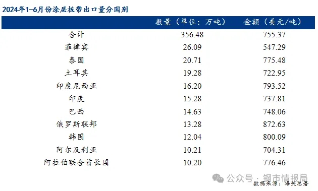 從我們出口的國別數據看,2024年1-6月份,出口最多的國家為菲律賓,為26.09萬噸,同時也是上半年出口金額最低的,平均價格為547.29美元/噸。2024年1-6月份,涂層板帶單噸出口均價在755.37美元/噸,而2023年的均價為949.83美元/噸。從價格的對比也不難看出,今年涂層板帶的出口好轉,很大部分的原因在于以價換量。