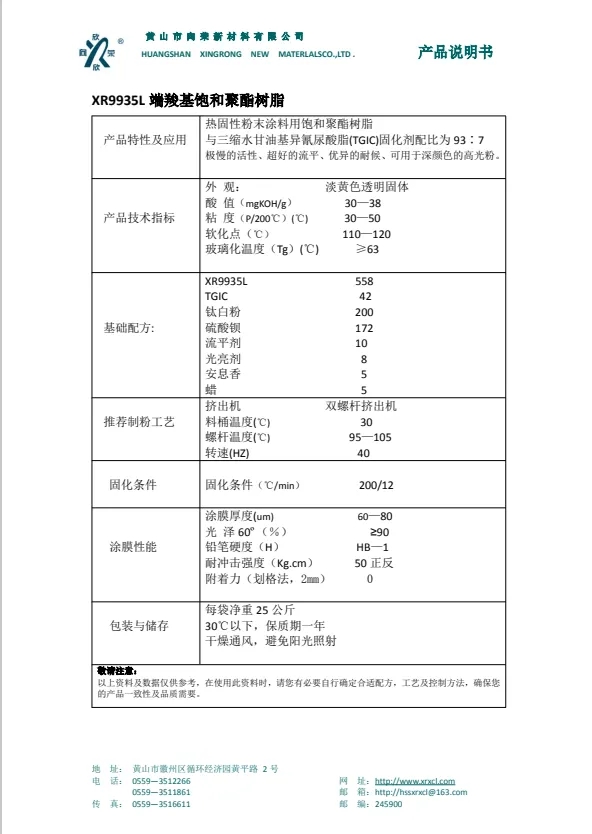 近期,公司又研發推出XR9935L端羧基飽和聚酯樹脂,具有慢速反應活性、超好的流平和豐滿度、優異的耐候性能,特別適用于吸油值較高的深色高光粉末,與三縮水甘油基異氰尿酸脂(TGIC)固化劑配比為93∶7,在工程機械粉末涂料當中,可以替代油漆當中的醇母,讓粉末涂料實現高光、高流平。