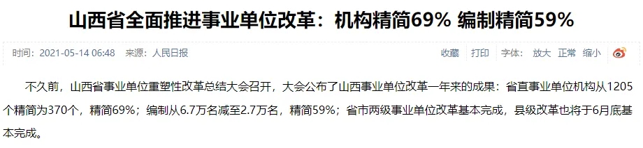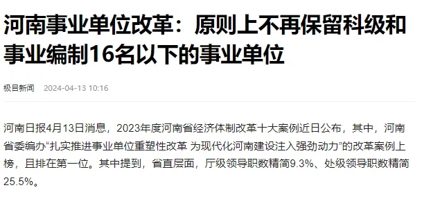 事實上,近幾年國家多次提出縮減公務人員編制的相關要求,政府機構這兩年也在逐漸完成改革重組工作。此前,中國戶籍人口第一大省——河南也傳出消息,省直事業機構按不低于50%精簡,編制精簡不低于30%,科級和事業編制16名以下的事業單位直接撤銷。最終結果是,連廳級領導職數都精簡了9.3%,處級領導職數直接砍掉了25.5%。