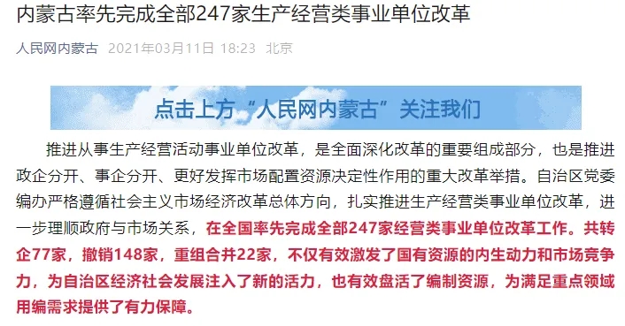 除了河南之外,另外幾個全國深化事業單位改革全域試點也陸續曝出動作。黑龍江早已完成改革,精簡事業單位2735個,收回事業編制8.3萬余名。內蒙古完成自治區247個經營類事業單位改革,區本級精簡收回3000余名事業編制。山西事業單位編制從6.7萬名減至2.7萬名,精簡4萬,有900多家經營性事業單位轉企改制。