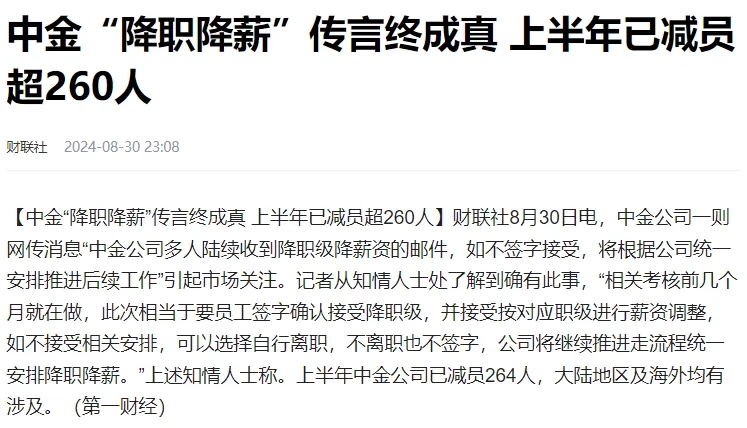 中金公司一則網傳消息“中金公司多人陸續收到降職級降薪資的郵件,如不簽字接受,將根據公司統一安排推進后續工作”引起市場關注。記者從知情人士處了解到確有此事,上述知情人士稱。上半年中金公司已減員264人,大陸地區及海外均有涉及。