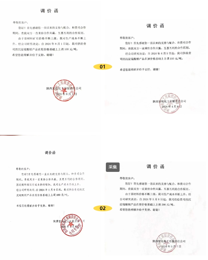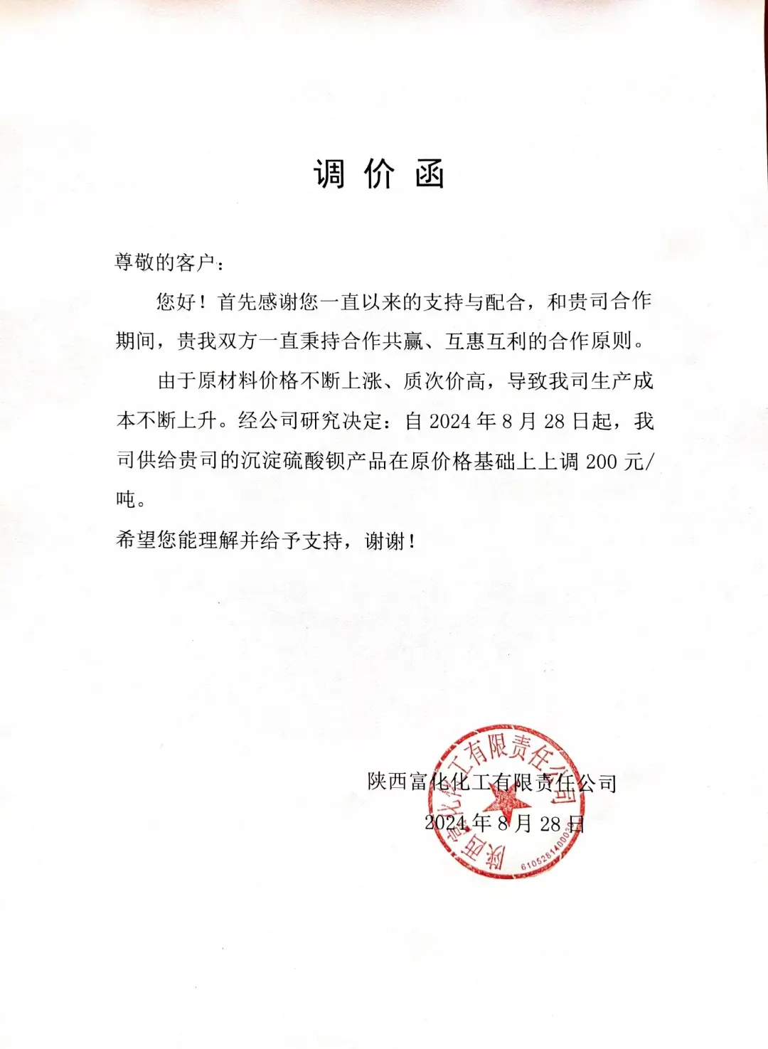 涂料采購(gòu)網(wǎng)注意到,這已經(jīng)是該企業(yè)在2024年發(fā)布的第5張漲價(jià)函。今年1月8日、4月8日,5月7日,8月1日,陜西富化化工宣布沉淀硫酸鋇產(chǎn)品價(jià)格分別上漲100元/噸、150元/噸、200元/噸、100元/噸,全年累計(jì)上漲750元/噸。