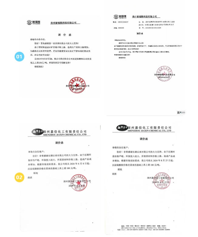 嘉信化工、貴州譽(yù)福隆科技等于6月和8月發(fā)布調(diào)價(jià)函,宣布沉淀硫酸鋇價(jià)格上調(diào)100元/噸。