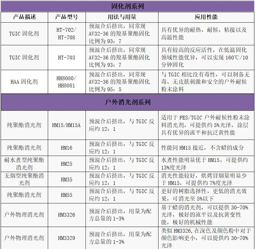 在這些產品之中,粉末涂料級TGIC產品經預混合后擠出,同常規AV32-36的羧基聚酯固化比例為93:7,可具備卓越的耐候、耐高溫、粘接等性能,還可實現160℃/10分鐘低溫固化。此外,另一款HAA產品則具備了一貫的無毒、無皮膚刺激等優越特性,可用來制備安全性突出、耐高溫和抗厚涂的戶外耐候性粉末涂料。