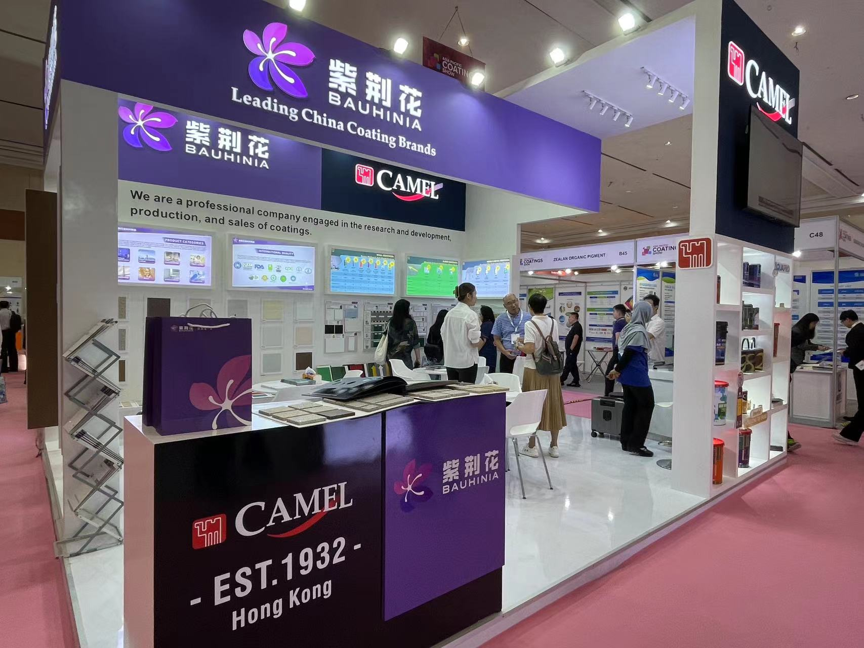 展會(huì)現(xiàn)場,紫荊花新材料集團(tuán)旗下紫荊花涂料和駱駝漆兩大品牌組成的聯(lián)合展臺,以簡潔而不失大氣的風(fēng)格呈現(xiàn),分別代表紫荊花涂料的紫色和代表駱駝漆的藍(lán)色交相輝映,讓人眼前一亮。紫荊花涂料展示了其豐富的全產(chǎn)品體系,包括工程外墻涂料、防腐涂料、家裝涂料、藝術(shù)涂料、無機(jī)涂料、地坪涂料、防火涂料、仿石涂料等產(chǎn)品悉數(shù)亮相;駱駝漆則重點(diǎn)展示了其中高端的家裝涂料、木器涂料等相關(guān)產(chǎn)品。紫荊花新材料集團(tuán)以其獨(dú)特的展臺設(shè)計(jì)和豐富的展品、實(shí)物樣板吸引了大量參觀者駐足交流咨詢。