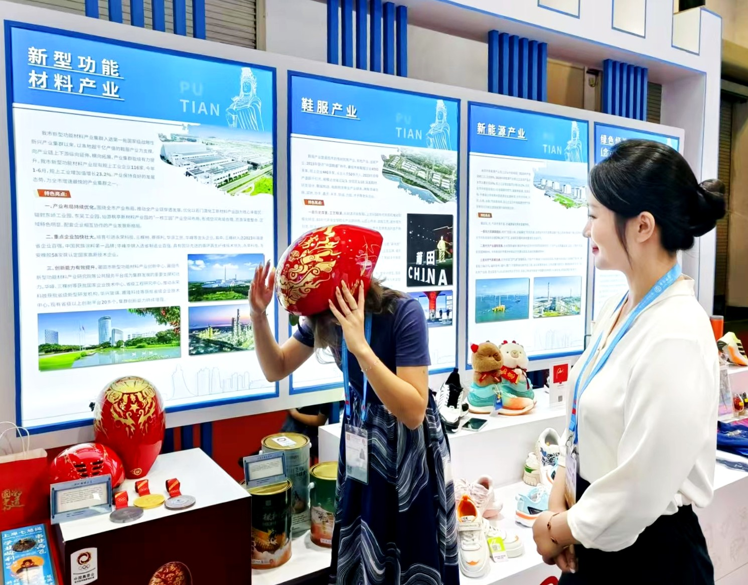 投洽會莆田館展品圍繞全市13條重點產業鏈布設,包括“莆田鞋”品牌系列產品、機器人產品、古典家具產品、食品產業產品等。其中,三棵樹攜麒麟頭盔、大圣頭盔、哪吒頭盔以及冬奧獎牌亮相新型功能材料產業展區,吸引了莆田市領導和許多中外游客的駐足參觀和體驗。三棵樹合作伙伴天桂攜桂圓加工產品參展。