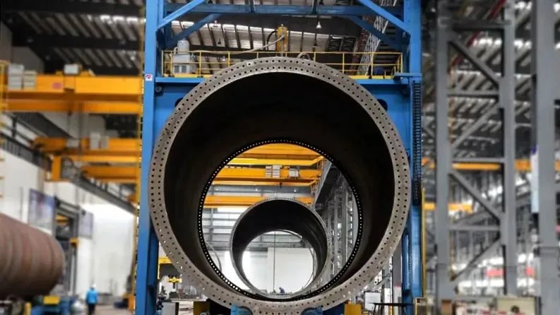 廣東陽江青洲六海上風電場項目位于陽江市陽西縣沙扒鎮附近海域,中心點離岸距離為52千米。該風電場水深范圍約36~46米,工程規劃裝機1000兆瓦,中國水電四局機械裝備公司陽江公司承制其中58套GWH252-13.6兆瓦金風機型塔筒,該機型塔筒總高度約121.332米,最大直徑8.474米,單套重量約810噸。截至目前,機械裝備公司陽江公司已完成35套,發貨28套,項目全面履約工作正在火熱進行中。