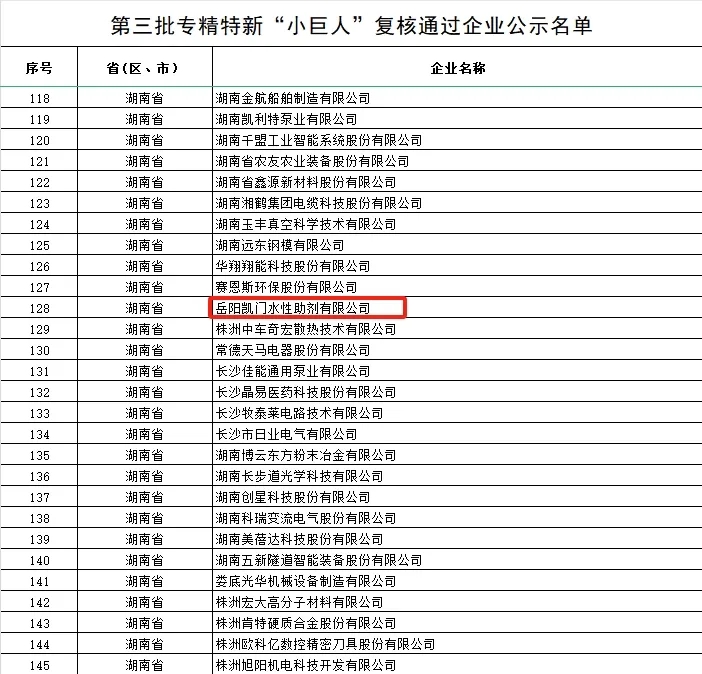 專精特新“小巨人”企業(yè)是國家為推動中小企業(yè)實現專業(yè)化、精細化、特色化、新穎化發(fā)展而設立的重要榮譽稱號,代表著企業(yè)在行業(yè)中的領先地位和技術創(chuàng)新能力。此次復核通過,進一步證明了凱門助劑在環(huán)保型助劑領域的技術實力、創(chuàng)新能力和市場競爭力。
