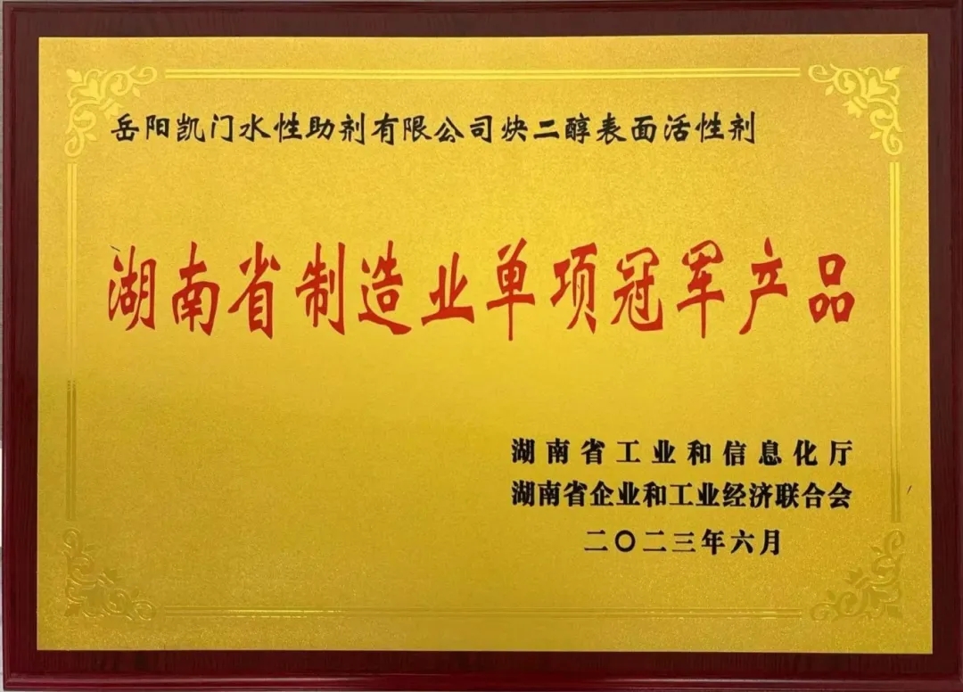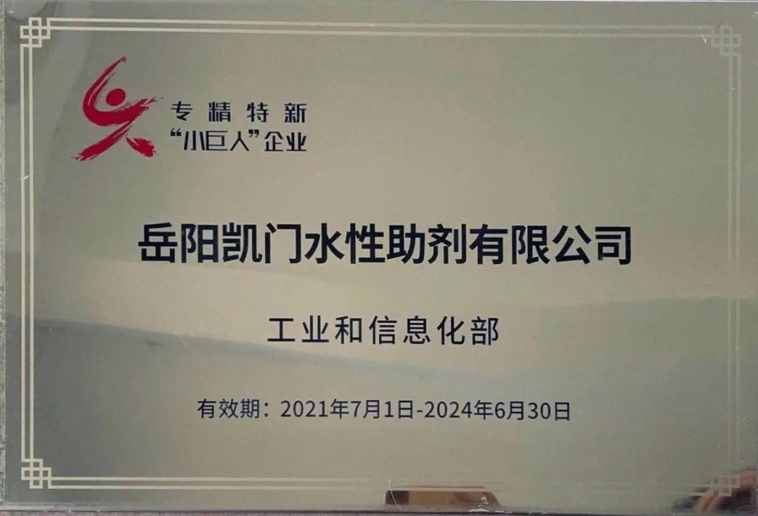 2021年,凱門助劑榮獲國家級專精特新“小巨人”企業(yè)榮譽稱號,始終專注于助劑領域的深耕細作,致力于為客戶提供高品質、高性能的助劑產品,不斷推動技術創(chuàng)新和產品升級,成功研發(fā)出多項核心技術,在市場上取得了廣泛應用和高度認可。2023年,企業(yè)研發(fā)的炔二醇表面活性劑榮獲湖南省制造業(yè)單項冠軍產品。