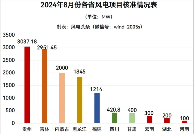 2024年8月風電項目獲核準的省份分別是甘肅、云南、貴州、吉林、內蒙古、黑龍江、福建、四川、湖北、河南等10個省份。