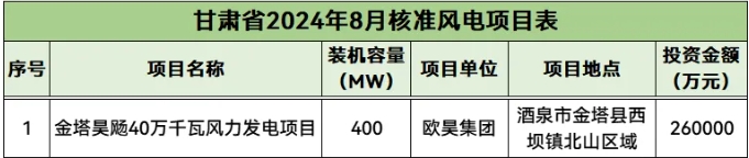 甘肅核準1個風電項目,總規模400MW,總投資260000萬元,為陸上風電項目。
