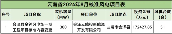 8月份,云南共計核準1個風電項目,總規模300MW,總投資172427.85萬元。
