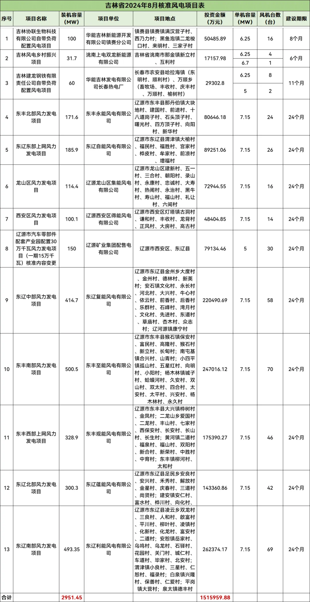 吉林核準13個風電項目,總規模2951.45MW,總投資1515959.88萬元,均為陸上風電項目。