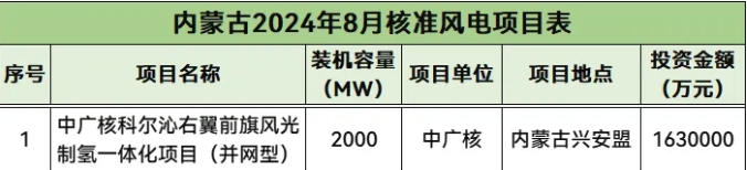 8月份,內蒙古共計核準1個風電項目,總規模2000MW,項目總投資約163億元。