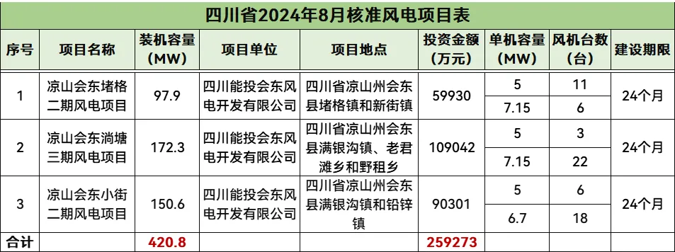 8月份,四川共計核準3個風電項目,總規模420.8MW,總投資259273萬元,均為陸上風電項目。