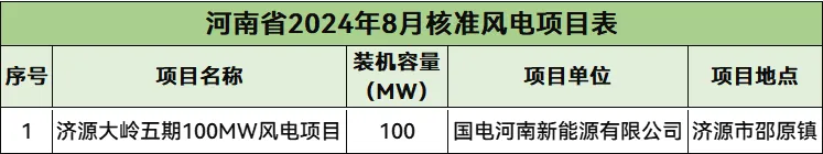 8月份,河南共計核準1個風電項目,總規模100MW。